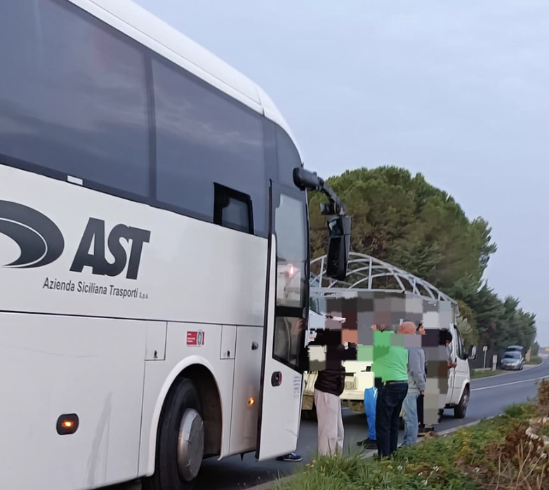 Alle prime ore dell’alba, sulla Ss 115 al km 333 in prossimità di Comiso, si è verificato un incidente stradale tra un bus di linea e un vecchio furgone Ford. Il bus, in fase di sorpasso, a quanto pare è stato stretto e quasi messo fuori strada dall’autista del veicolo Ford, migrante. Nell’impatto il bus rimane danneggiato allo specchio panoramico retrovisore del lato destro. Dopo l’incidente l’autista del bus sarebbe stato aggredito dal migrante per fortuna senza conseguenze. Sul posto due volanti della polizia di Stato (foto Franco Assenza).